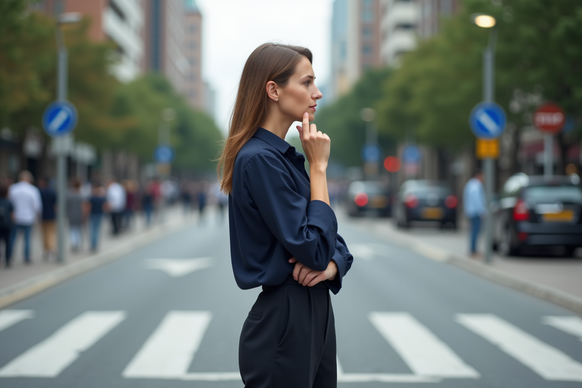 Femme pensive à un croisement urbain en matinée